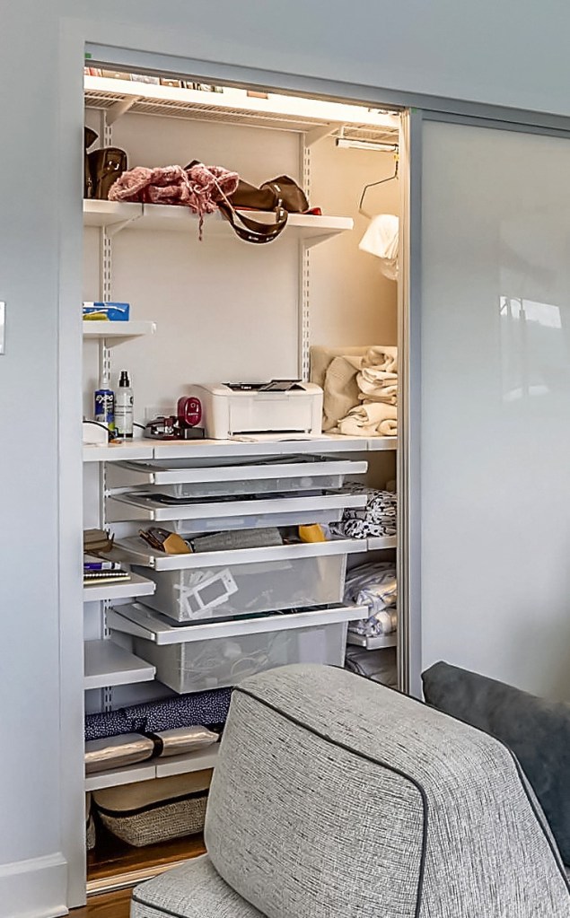The closets accommodate clothes, linens, a printer and other office items, and in the center hall closet (“the garage closet”) all manner of things usually found in a garage including luggage, tools, cleaning supplies, and a vacuum cleaner. Top-of-the-line built-ins and adjustable organizing systems envisioned by Courtenay Hamilton of Corganized LLC were installed in all of the closets for maximum efficiency. The organizing systems of five of the six closets can be reconfigured to suit the buyer’s specific needs.