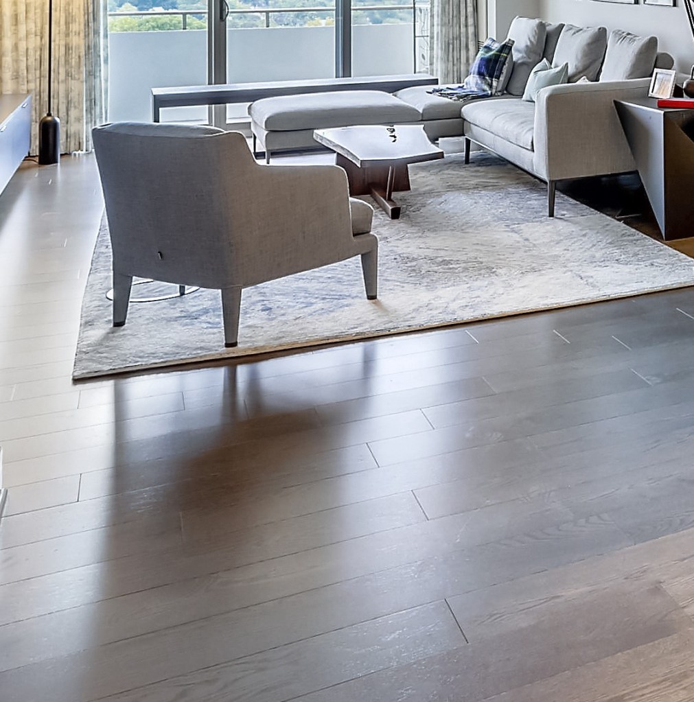 The old parquet flooring and 300 lbs. of black wood glue was removed. The charcoal-stained red oak plank flooring made by Mirage Floors, custom stained at the factory and installed on a new subfloor, gracefully unifies all the living and sleeping areas and the kitchen.
